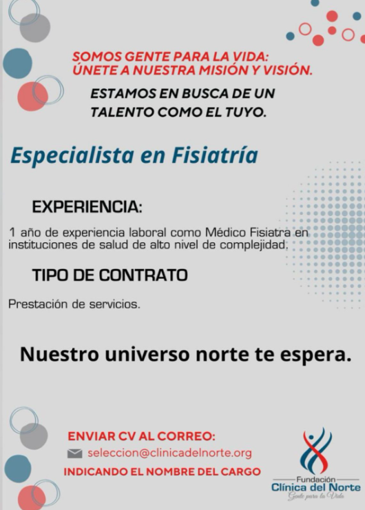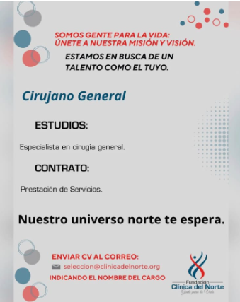Te invitamos a conocer las vacantes que tenemos disponibles en nuestras redes sociales, si aplican para ti, envía tu hoja de vida al correo electrónico seleccion@clinicadelnorte.org o ingresa aquí y menciona en el asunto el cargo al cual aspiras.